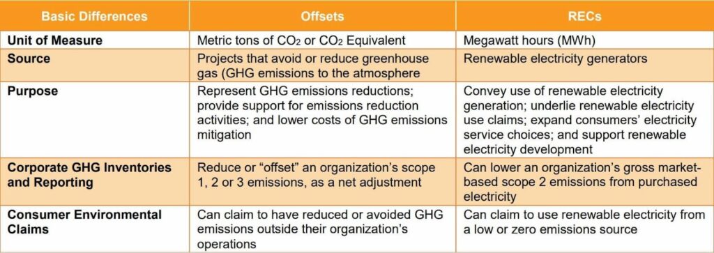This table summarizes the key differences between using RECs and carbon offsets in a project. (Source: EPA)